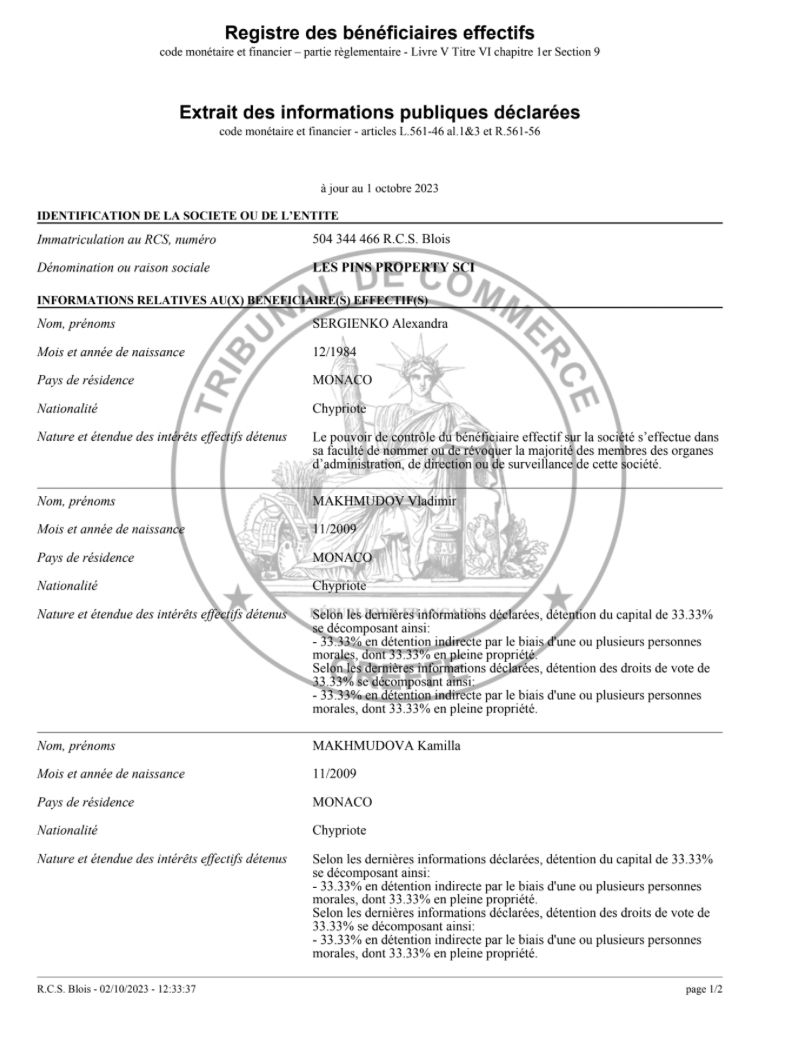 The Insider pointed out that Makhmudov Jr.'s partner in Les Tesnieres Property SCI is once-famous model Alexandra Sergienko – likely his wife.