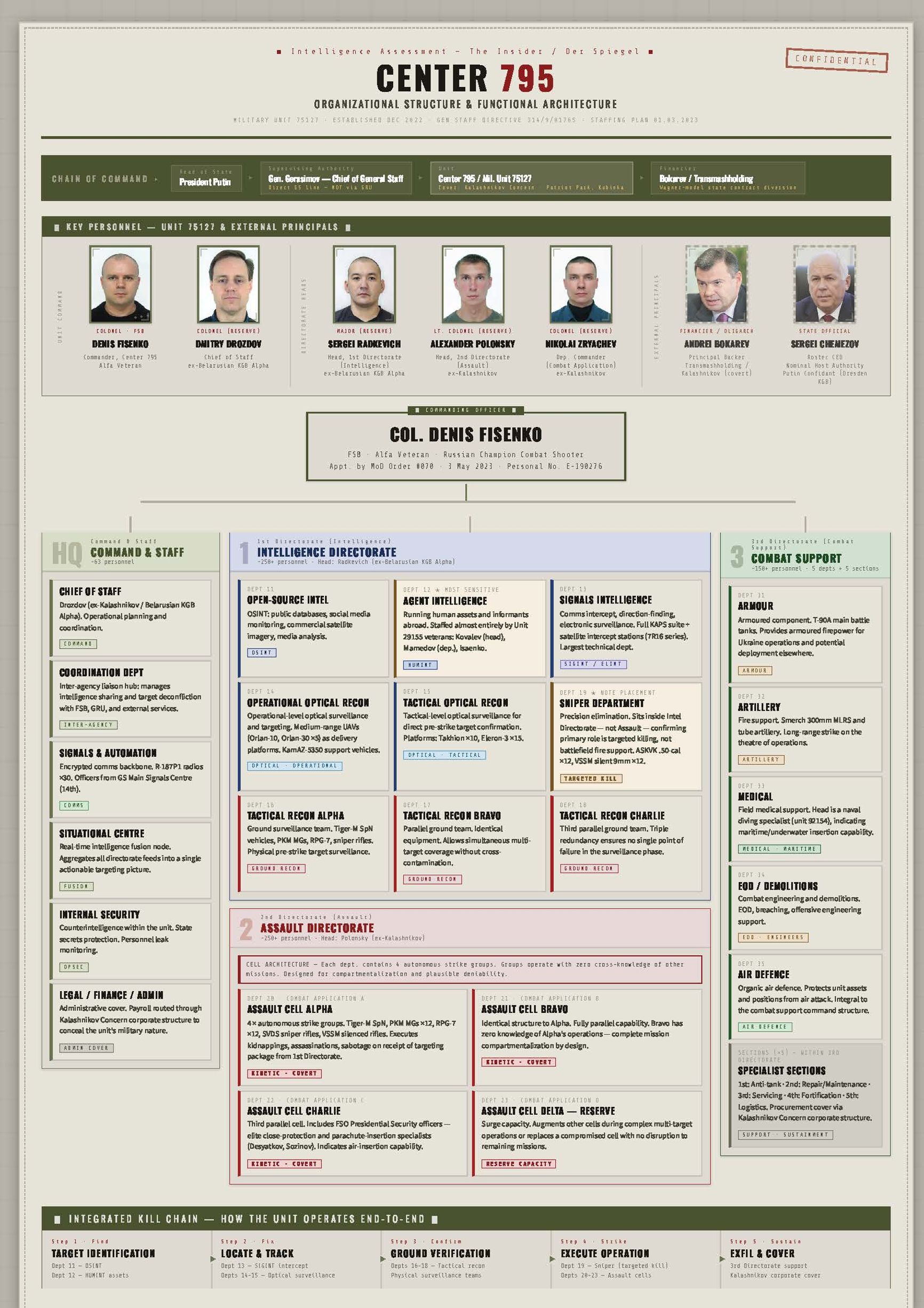 The organizational blueprint of Center 795, which can be seen in a staffing spreadsheet from January 2023 obtained by The Insider, reveals a “full-cycle” mandate designed to bypass the bureaucratic and security vulnerabilities that previously compromised other GRU operations. By staffing the unit with high-tier veterans from the FSB's elite Alfa and Vympel squads — operatives like Denis Fisenko and Nikolay Zriachev who possess a “proven track record” — the Kremlin had created a hybrid entity capable of transitioning seamlessly from clandestine agent intelligence (12th Department) to heavy kinetic strikes (1st though 6th Departments).