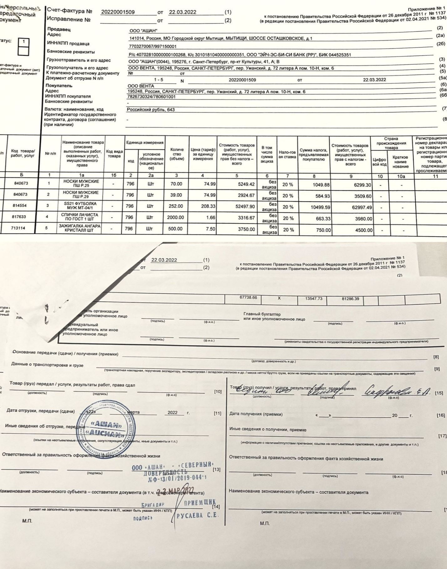 On the morning of March 22, 2022, a third-party carrier arrived at Auchan Severny to pick up the four pallets of “humanitarian aid,” including toothpaste. One person, “leading engineer Safronova E.A.,” signed for all 10 legal entities.