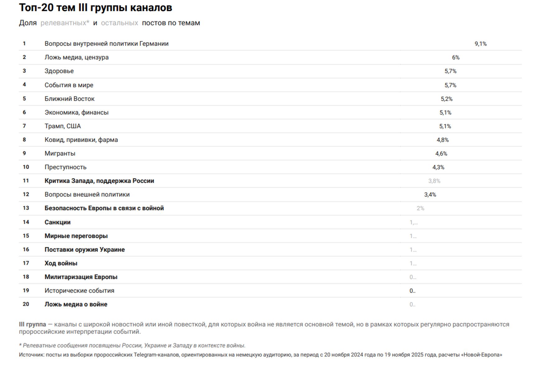Сюда входят и немецкие каналы с довольно общей повесткой: в основном они сфокусированы на новостях и вопросах внутренней политики — выборах, экономике, миграционном кризисе, социальных проблемах, здравоохранении и так далее. Россия сама по себе интересует эту аудиторию очень мало.