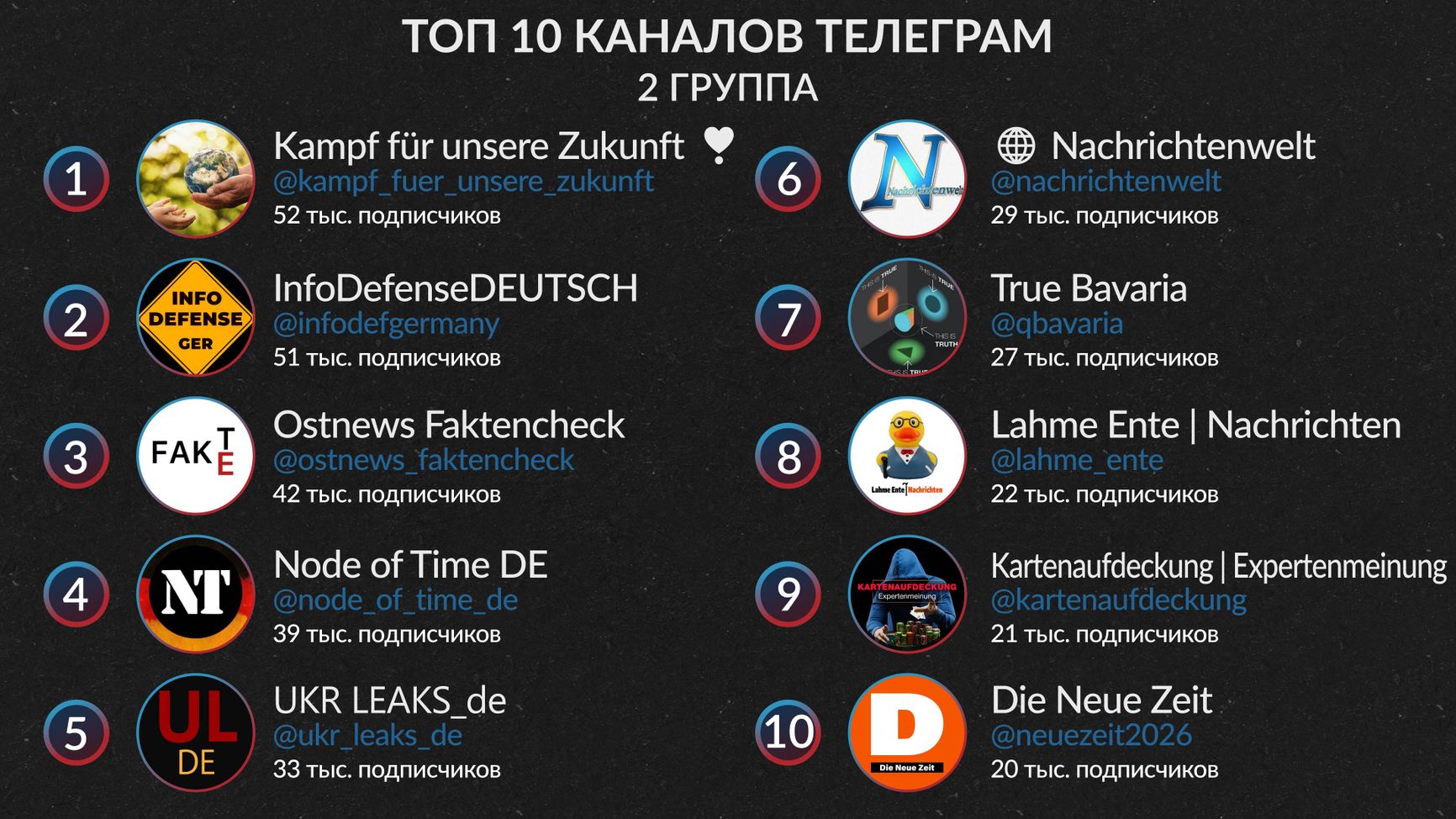 Эта группа служит «переходником» между открытой пророссийской пропагандой и ее адаптированной, более респектабельной версией, ориентированной на широкую немецкоязычную аудиторию. Открытая связь с RT воспринимается немцами (даже голосующими за АдГ) не очень хорошо, но когда ссылка ведет на некие анонимные каналы, под видом экспертной аналитики «разоблачающие ложь мейнстримных медиа», это хорошо продается.