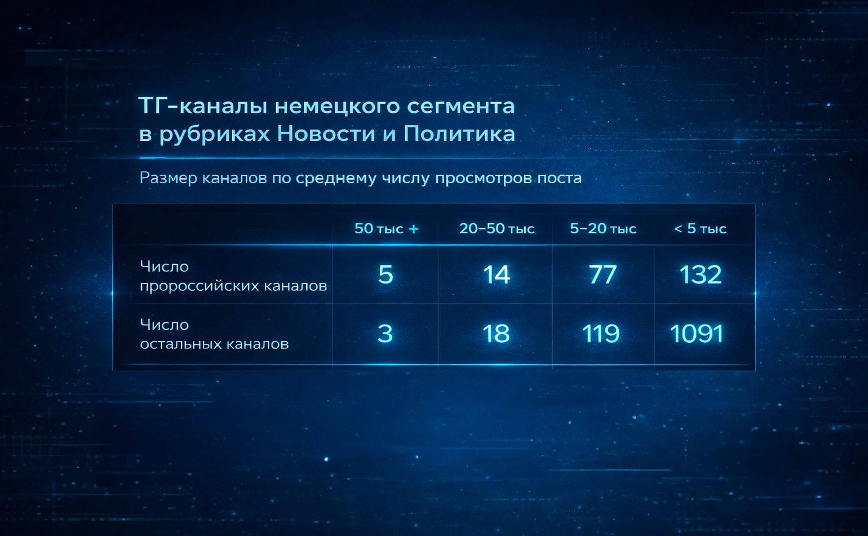 Всего в Германии, по данным агрегатора статистики Telemetr.io, существует около 9,5 тысячи каналов (сервис не поясняет, как именно он определяет страновую принадлежность канала, но известно, что он учитывает язык, контент — например, частоту упоминаний тех или иных локаций и известных лиц — и окружение, то есть тех, кто репостит сообщения). Общий размер их аудитории оценить сложно, известно лишь, что суммарный охват всех этих каналов, аудитория которых пересекается, — 60 млн пользователей, а крупнейшие из каналов имеют среднее число просмотров поста около 100 тысяч человек. Это позволяет предположить, что реальная немецкая аудитория Telegram составляет несколько миллионов человек, что, хотя и не может конкурировать с традиционными СМИ и YouTube, все же электорально значимо.
