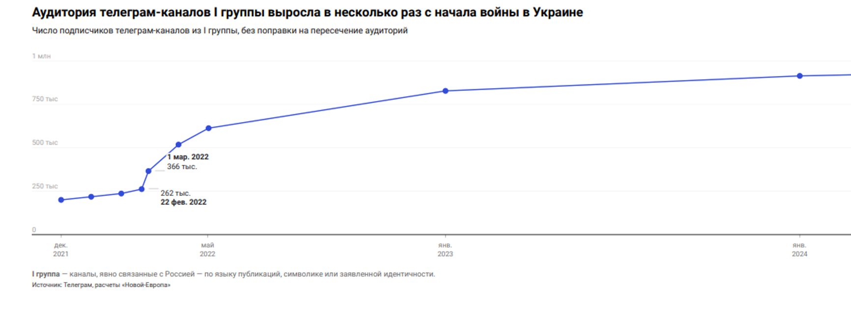 Почти треть каналов первой группы (16 из 47) были созданы в течение нескольких месяцев до или после начала полномасштабной войны. Так, например, канал Алины Липп Neues aus Russland был создан в ноябре 2021 года, а в марте 2022 были запущены CraZy Bear 2022 и «Папочка канцлера». Но и те каналы, которые были созданы раньше, начали резко набирать подписчиков только во время полномасштабного вторжения. В целом общая аудитория первой группы в начале вторжения выросла в несколько раз: с 220 тысяч подписчиков до 575 тысяч уже через два месяца после начала вторжения и почти миллиона к началу 2025 года (это общее число не учитывает взаимные пересечения, так что реальное общее число подписчиков в разы меньше).