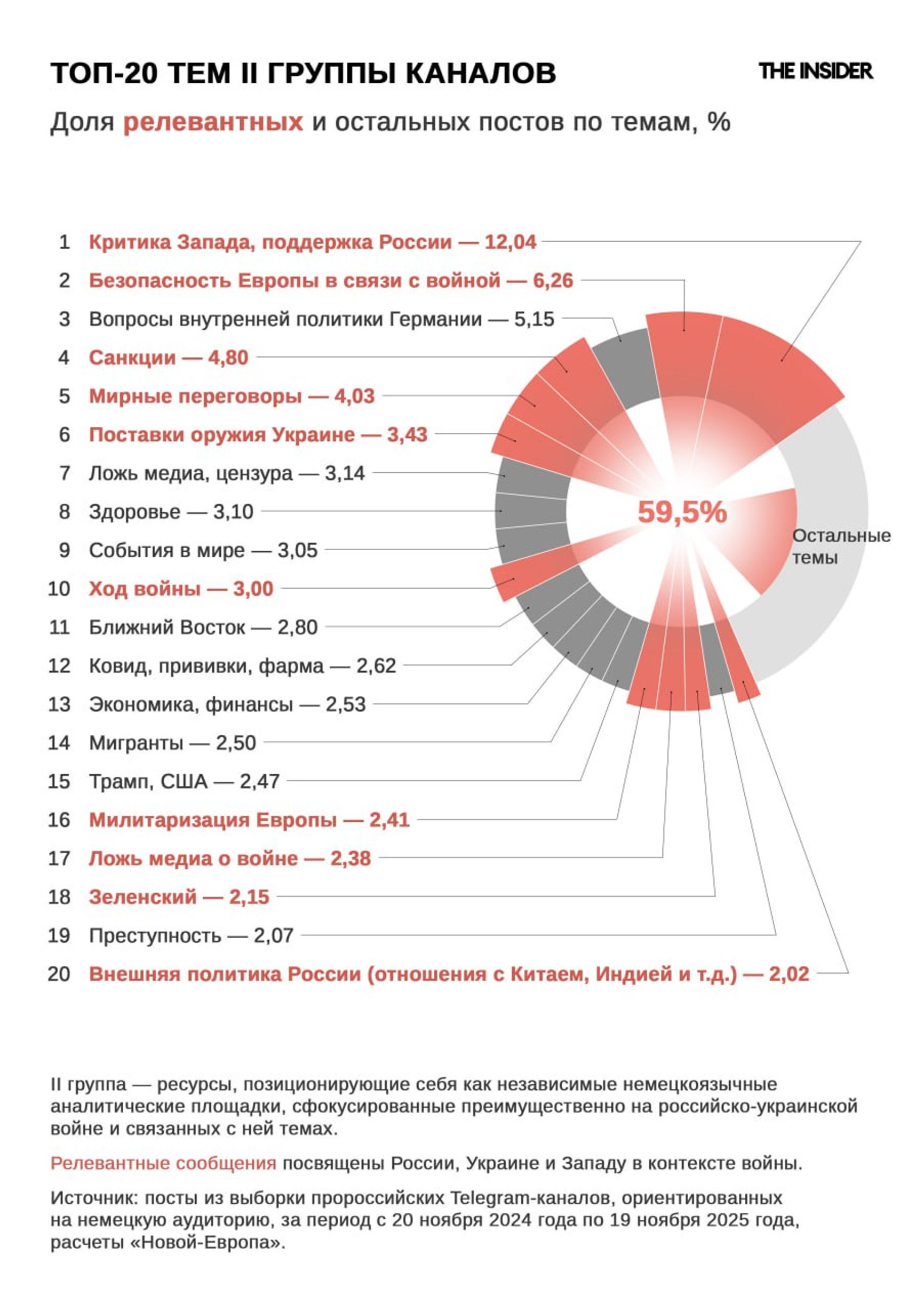 Каналы можно разделить на три группы. Первая — «боевое крыло», она разгоняет эмоциональный накал и выступает «поставщиком сырья», опираясь преимущественно на внутренние российские Z-источники. Вторая группа маскирует пропагандистский контент под аналитику, она относительно редко ссылается на российские Z-каналы, гораздо чаще цитируя первую группу. В эту группу входит меньшее число каналов, а охват аудитории почти в два раза ниже, чем у первой, однако она проделывает важнейшую работу, адаптируя пророссийский контент для немецких новостных и политических пабликов третьей группы.
