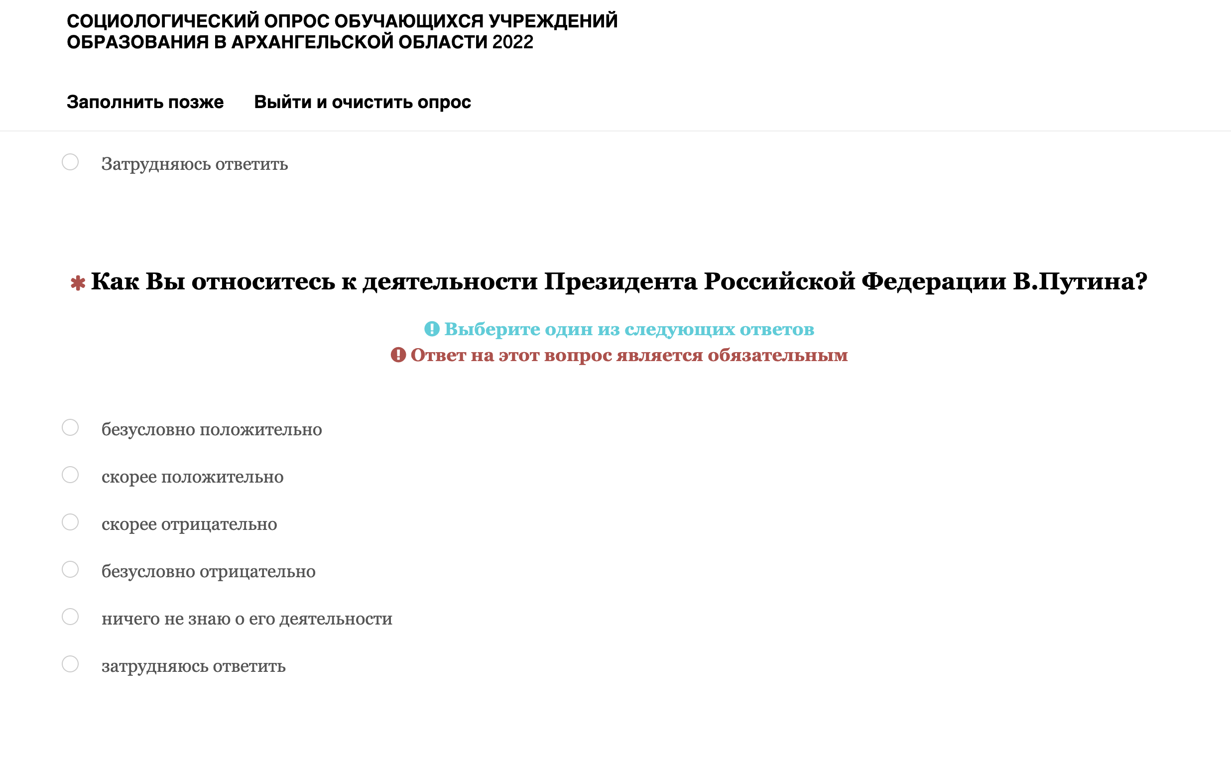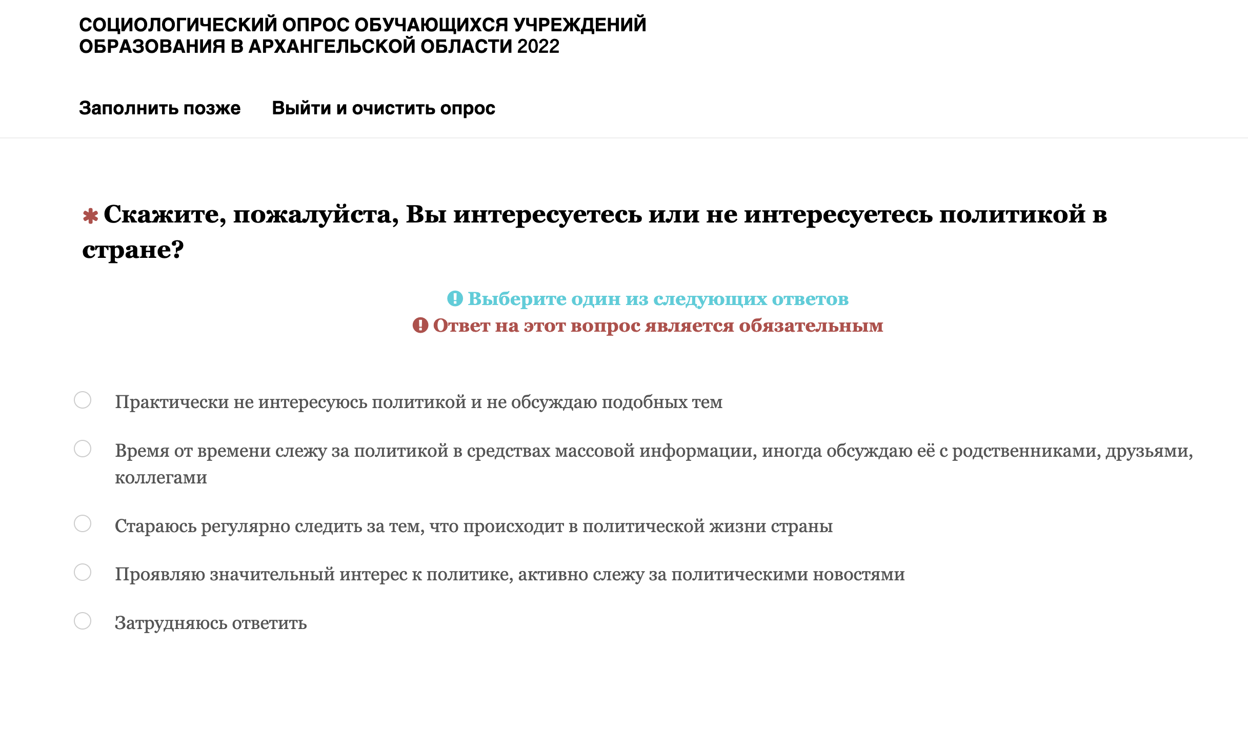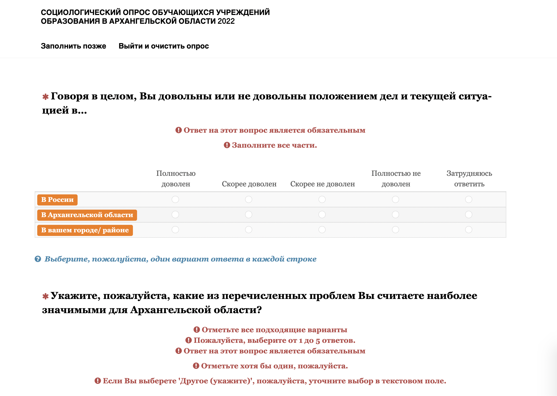 Помимо прочего, у школьников поинтересовались, как они относятся к деятельности губернатора Архангельской области Александра Цыбульского, какие проблемы в области они считают наиболее значимыми и что они планируют предпринимать, если эти проблемы не будут решаться. Также там есть вопросы о том, удовлетворены ли ученики своей жизнью, что они думают об экстремизме и как относятся к людям разных национальностей и других религий.