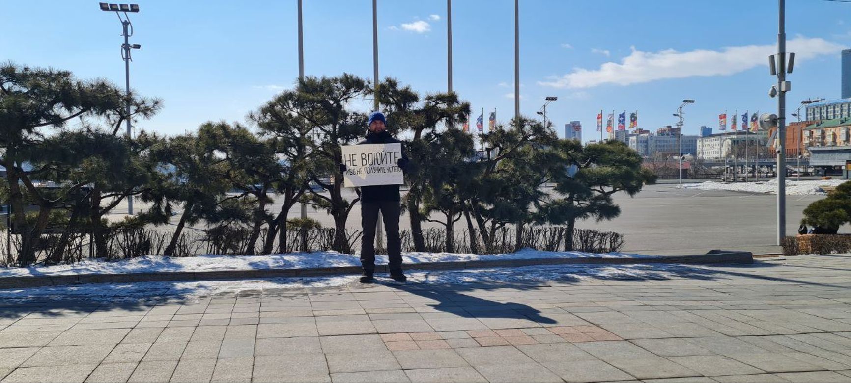 Еще одного россиянина задержали во Владивостоке, однако позже правоохранители отпустили его без составления протокола. Он вышел на центральную площадь города с антивоенным плакатом с надписью «Не воюйте», сообщает «ОВД-Инфо Live». Издание публикует фото, предоставленное задержанным мужчиной.