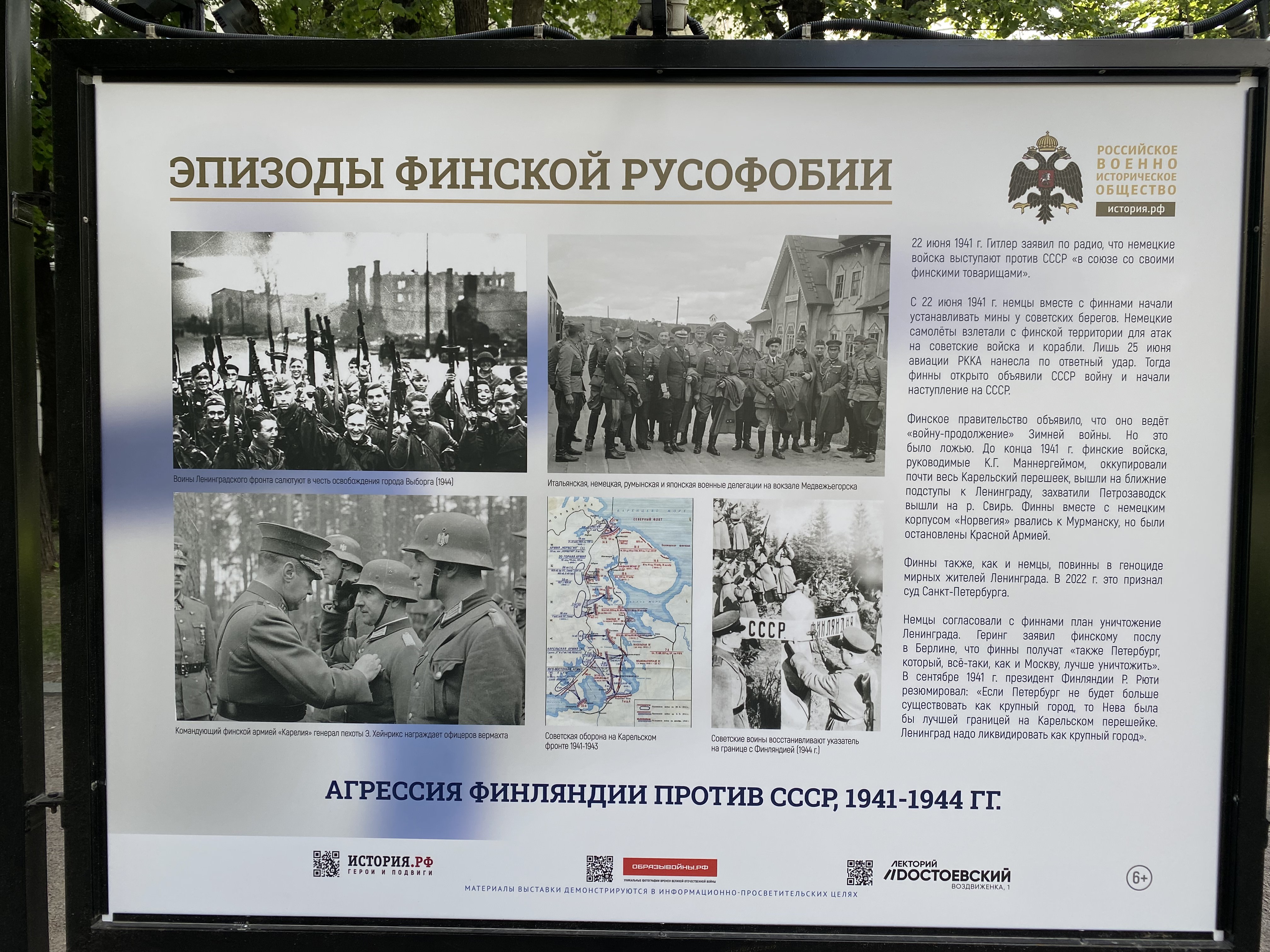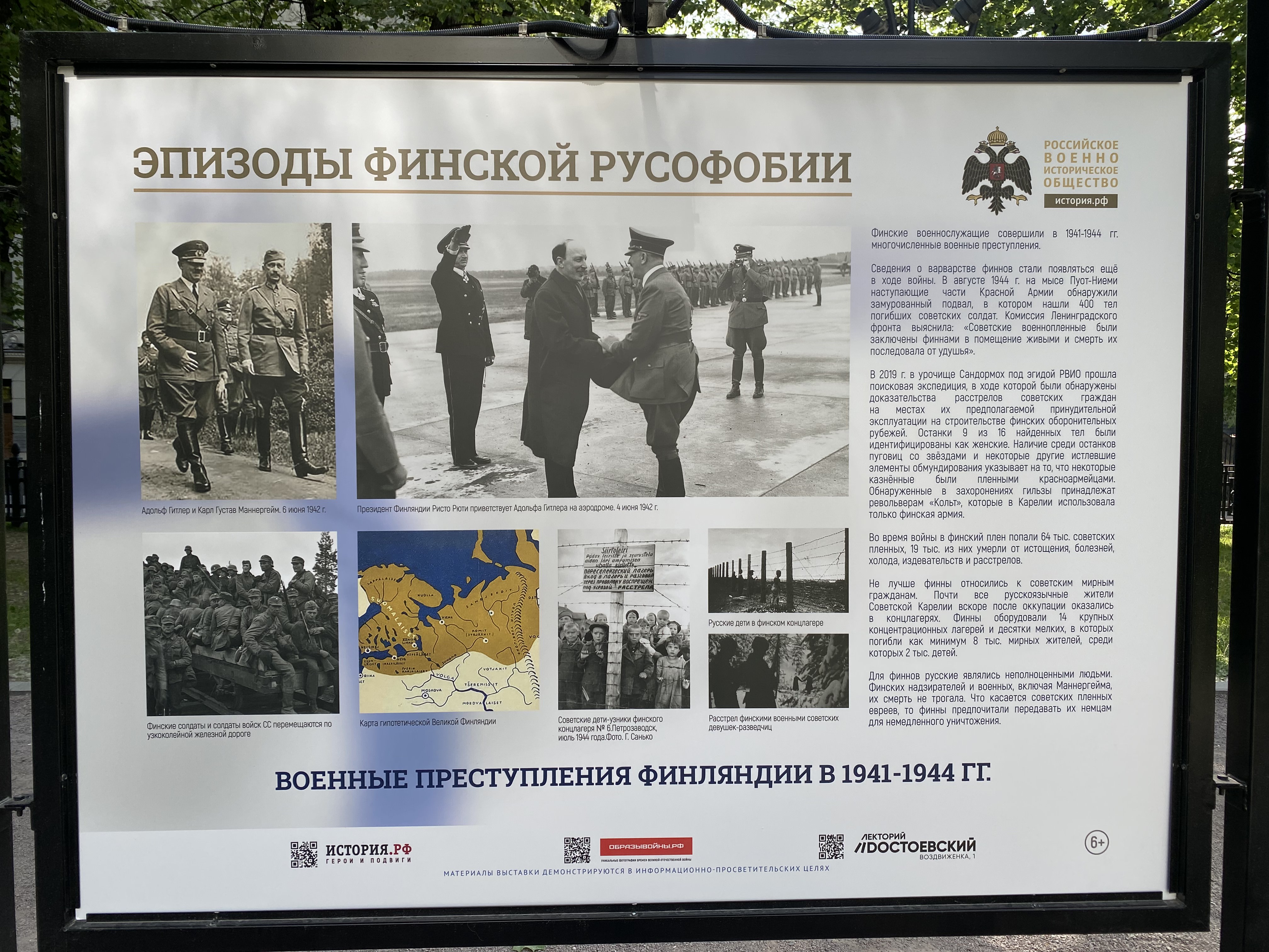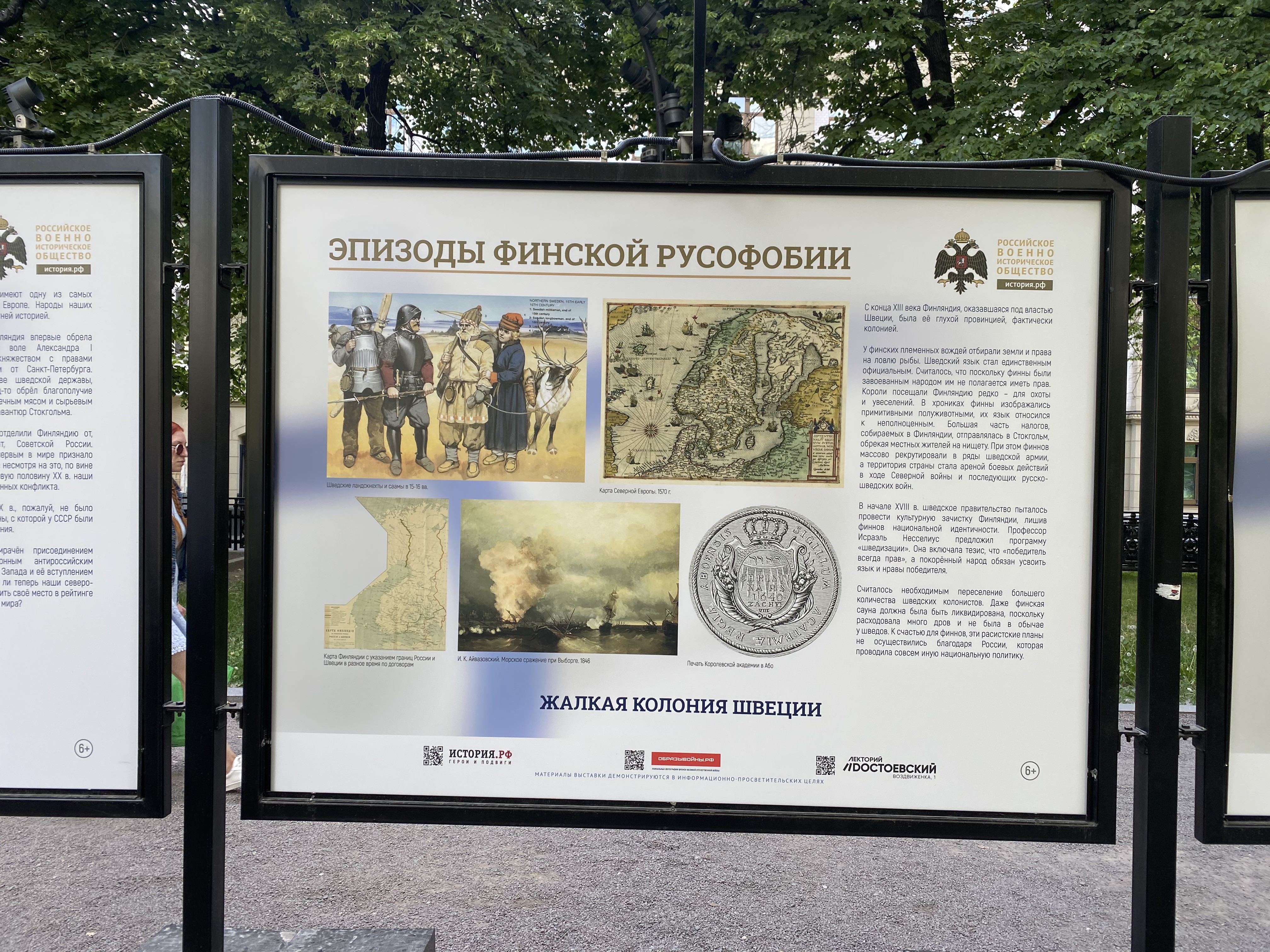 В Москве на уличных стендах проходит выставка Российского военно-исторического общества (РВИО) под названием «Эпизоды финской русофобии». В материалах выставки Финляндию называют «жалкой колонией Швеции», которая получила все права и свободы только после присоединения к России, а также рассказывают, что виновниками массовых расстрелов в Сандармохе были финны, а вовсе не НКВД.