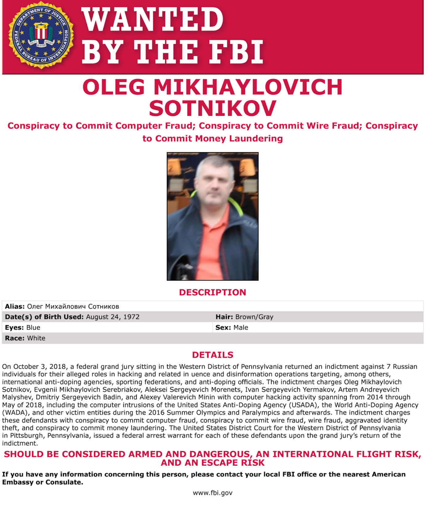 В США и Европе Сотникова знают по другой причине: в апреле 2018 года он сопровождал операцию хакеров из в/ч 26165 ГРУ (также известную как APT 28, или Fancy Bear) при попытке взломать WiFi-сеть штаб-квартиры Организации по запрещению химического оружия (ОЗХО) в Гааге. ОЗХО была вдвойне интересна российским шпионам: во-первых, организация исследовала анализы беглого разведчика Сергея Скрипаля, месяцем ранее отравленного «Новичком» в Солсбери, а во-вторых, она исследовала применение химического оружия в Сирии, где российские войска воевали на стороне диктатора Асада. В 2016 году во время Олимпийских игр в Бразилии та же группа хакеров успешно взломала Всемирное антидопинговое агентство (ВАДА), которое исследовало курируемую ФСБ программу допинга для российских спортсменов. Сотников под прикрытием сотрудника российского консульства в Рио-де-Жанейро сопровождал эту операцию. Но вот взломать ОЗХО ГРУшникам не удалось — шпионы были арестованы и высланы в Россию.