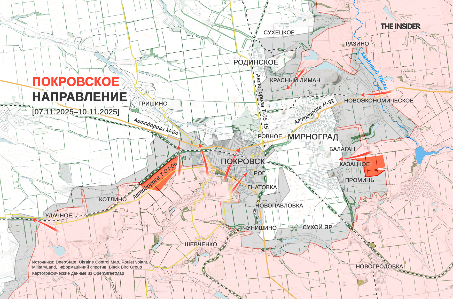 В Минобороны РФ заявили о захвате Гнатовки, примыкающей к Покровску (до 2016 года — Красноармейск) с юго-востока. В DeepState зафиксировали продвижение российских военных в районе Казацкого (до 2024 года — Московское) к востоку от Мирнограда и около Котлина (до 2016 года — Димитрово) на юго-западном охвате Покровска. В проекте рассказывали 8 ноября 2025 года, что СОУ выявляют и поражают российских военных по всей территории Покровска, а ВС РФ пытаются завести в город операторов дронов и минометчиков. Аналитики также предупреждают об угрозе оперативного окружения Мирнограда, в то время как в городе и так практически отсутствует снабжение. По оценке аналитиков, в ближайшее время удерживать Мирноград, на восточных окраинах которого уже закрепляются бойцы ВС РФ, станет невозможно.