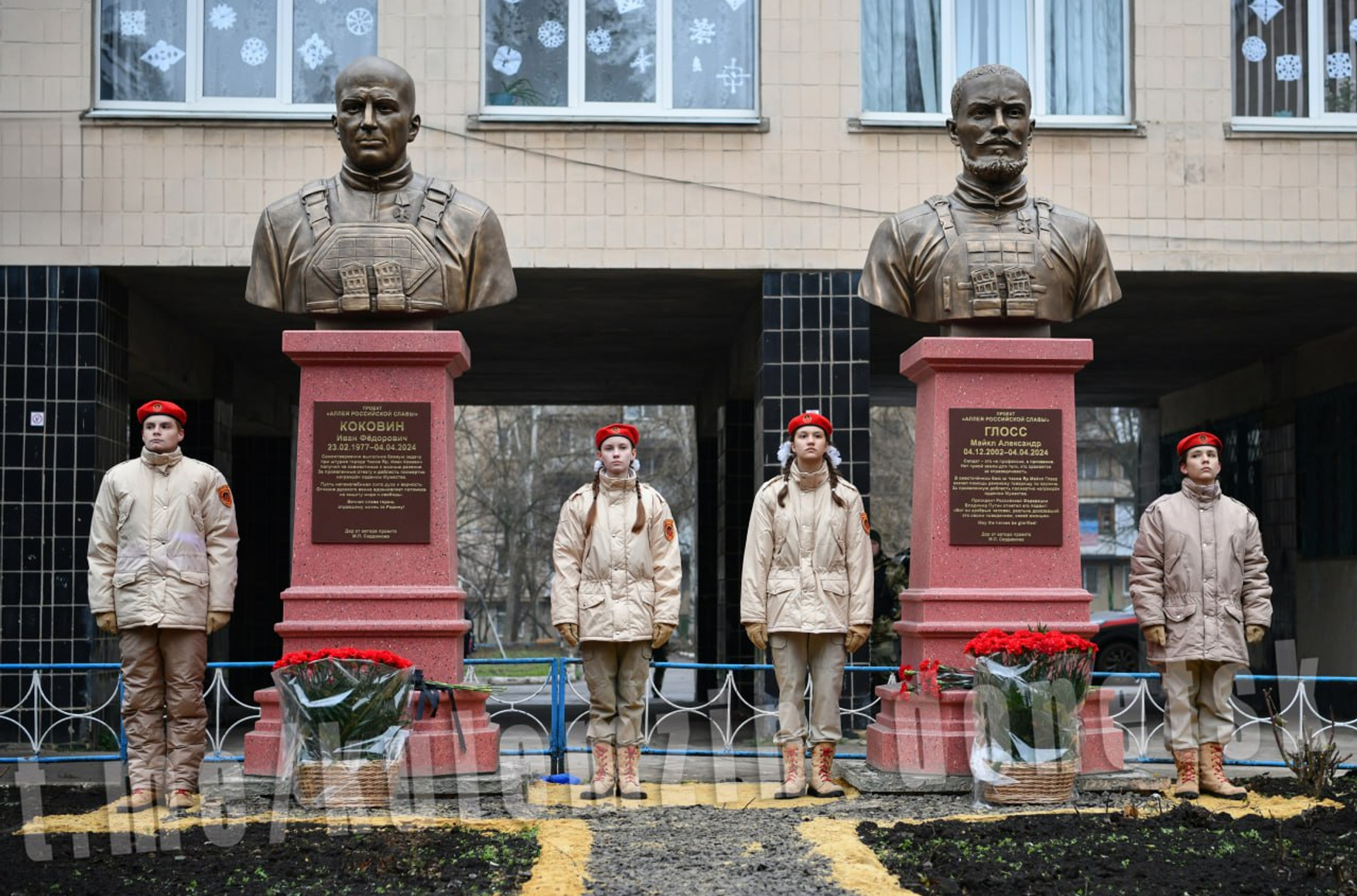 В донецкой школе № 115 открыли памятники двум участникам «СВО» — ефрейтору Ивану Коковину и рядовому Майклу Глоссу. Коковин принимал участие в штурме города, пишет «глава» Донецка Алексей Кулемзин. Памятники открывали под аккомпанемент группы «Голубые береты».