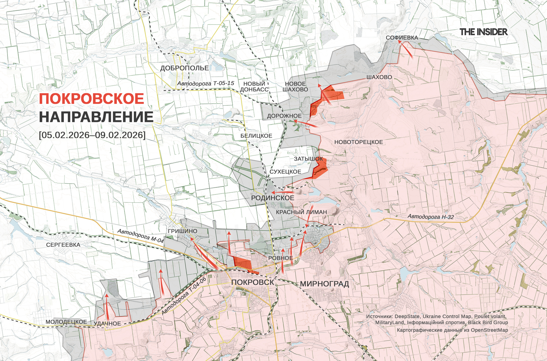 В DeepState зафиксировали продвижение ВС РФ возле Затышка (до 2024 года — Суворово) и Нового Шахова (до 2016 года — Розы Люксембург) на Добропольском выступе, а также в северной части Покровска (до 2016 года — Красноармейск). В проекте рассказывают, что ситуация в районе покровско-мирноградской агломерации продолжает ухудшаться: российские военные накапливаются в северной части Покровска, пользуясь тем, что внимание украинских дроноводов отвлекается на Гришино, а также атакуют Родинское, через которое пролегает последний потенциальный маршрут отхода из Мирнограда (до 2016 года — Димитров), и осуществляют рейды к западу от города в поисках позиций украинских операторов БПЛА.