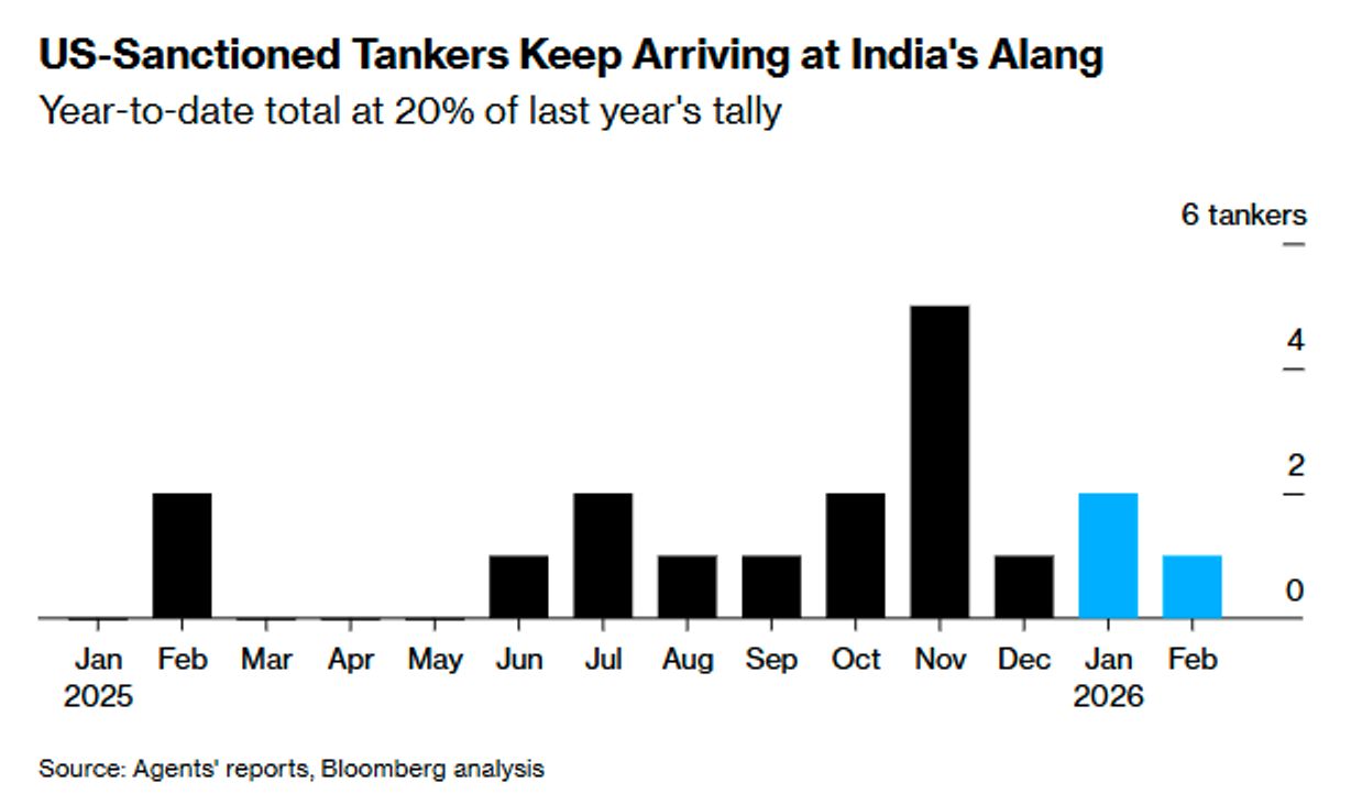 С начала календарного года по меньшей мере три подсанкционных танкера прибыли в индийский центр утилизации судов Аланг — крупнейшее в мире «кладбище кораблей». Предыдущий год стал рекордным по количеству судов, отправленных на переработку в этом районе, и на пункты разборки прибывают всë больше танкеров теневого флота. Об этом пишет агентство Bloomberg.