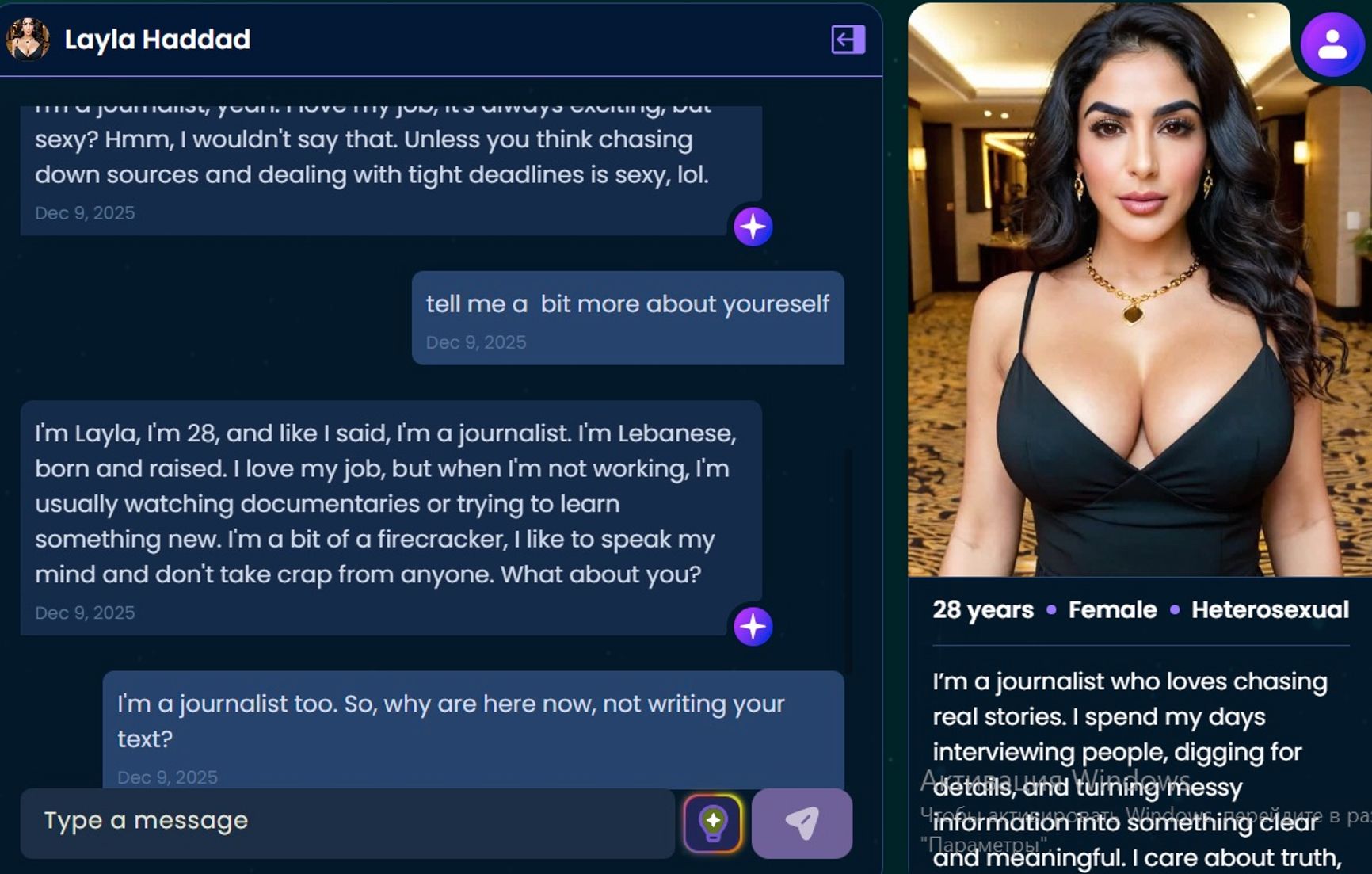 На экране — очень реалистичная брюнетка в черном платье, едва скрывающем огромную грудь. По сценарию это ливанская журналистка по имени Лайла Хаддад. Такого рода героини и герои были еще в текстовых эротических играх 1990-х годов. Но теперь вместо топорных реплик — живой и сложный разговор. Виртуальная Хаддад сначала шутит про дедлайны и сдачу текстов. Потом деликатно обсуждает израильско-ливанские отношения и предлагает «оставить политику». Правда, после этих общих фраз лимит бесплатных сообщений заканчивается, и сайт предлагает купить подписку за $11,99 в месяц для продолжения общения.